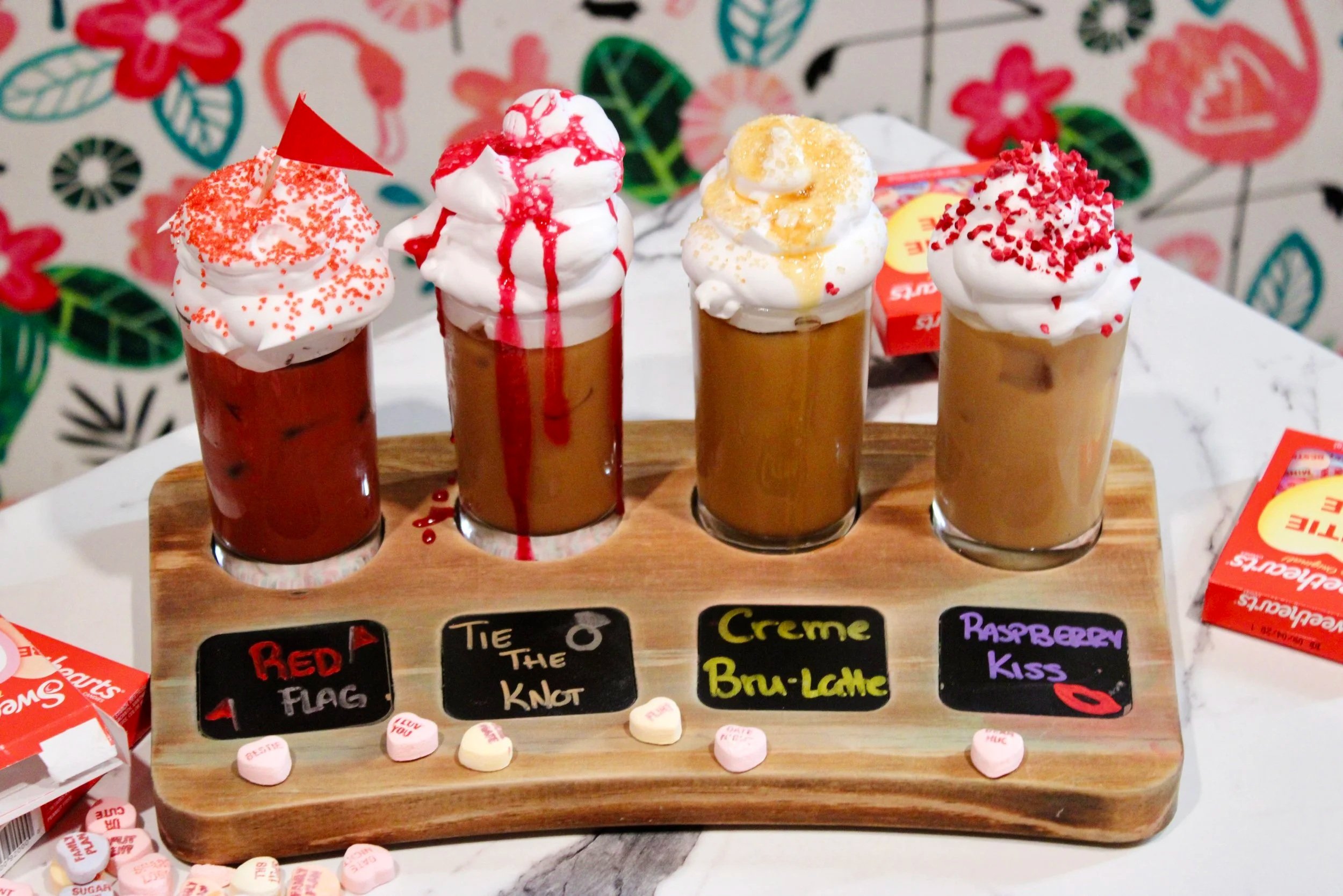 Featuring 4 mini lattes: Red Flag, Tie The Knot, Creme Bru-Latte, Raspberry Kiss